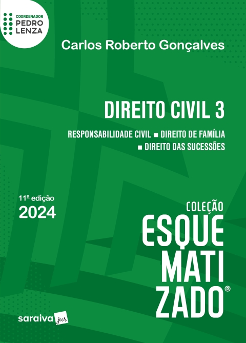 A Saraiva Educação. selo SaraivaJur. apresenta a 11ª edição da obra Direito Civil 3. da Coleção Esquematizado®. do experiente autor Carlos Roberto Gonçalves. com a coordenação de Professor Lenza. Este volume é dedicado à responsabilidade civil. ao direito de família e ao direito das sucessões. A obra é indicada para os alunos de graduação e para os candidatos a concursos públicos. seja da área jurídica ou não jurídica. de nível superior ou mesmo de nível médio. Com projeto gráfico especialmente pensado para otimizar a preparação dos alunos para provas e exames. a metodologia aplicada na obra proporciona ao leitor uma leitura mais dinâmica e estimulante. favorecendo a assimilação do conteúdo. Além de apresentar recursos gráficos e palavras-chaves em negrito durante todo o livro. que favorecem a assimilação dos principais temas. ao final de cada capítulo. o assunto é apresentado em formato de quadro com resumo da matéria e de questões de provas de concursos. Esta edição oferece ao leitor um material super atualizado. repleto de exemplos práticos e sintonizado com a jurisprudência dos tribunais superiores. Esta obra é indispensável para o aluno que deseja compreender os institutos do Direito Civil. Data de fechamento da edição: 30/10/2023