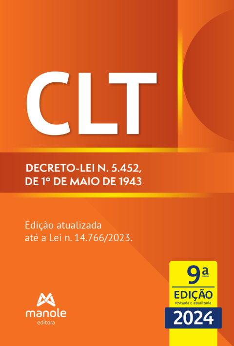 A Editora Manole. prosseguindo com suas publicações jurídicas. apresenta a nona edição de seu volume de bolso contendo exclusivamente a Consolidação das Leis do Trabalho (Decreto lei n. 5.452. de 01.05.1943). devidamente atualizada até a Lei n. 14.690: Desenrola Brasil sobre a contratações de operações de crédito. Esta edição está atualizada até o dia 19.12.2023