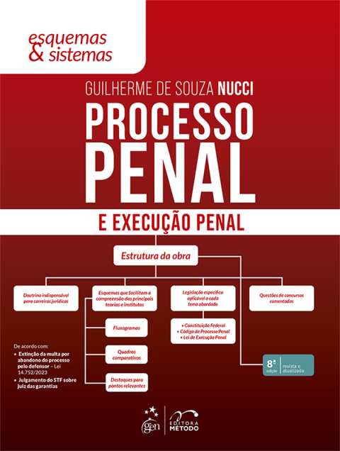 A coleção Esquemas & Sistemas. voltada aos principais concursos públicos para carreiras jurídicas. proporciona ao leitor o ingresso no universo das ciências criminais de modo facilitado e didático. valendo-se de recursos visuais e textos explicativos com o essencial da doutrina e a legislação pertinente. Um volume contempla a disciplina de Direito Penal; o outro. o Direito Processual Penal e Execução Penal. A reconhecida didática do Professor Guilherme de Souza Nucci se traduz em uma abordagem clara e direta. ilustrada por esquemas e quadros sinóticos que otimizam a compreensão dos temas. Para melhor assimilação da matéria. integra os textos legais de forma prática e objetiva e traz comentários de questões de concursos para que o leitor possa consolidar o aprendizado. A experiência auferida no magistério. em cursos de graduação e de pós-graduação. e na preparação para concursos públicos permitiu ao autor construir um sólido conteúdo acadêmico. que resultou em uma produção jurídico-literária que ultrapassa 40 títulos