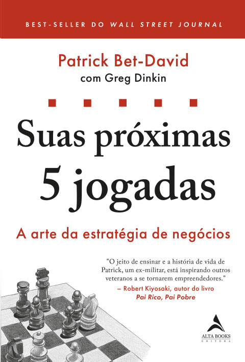 "Patrick é um dos pensadores mais fascinantes com quem tive a oportunidade de conversar."– Ray Dalio. autor de Princípios "Patrick é um dos indivíduos mais focados nos objetivos que já conheci. Seus feitos foram inspiração para muitos. inclusive para mim. Não sou apenas um amigo. sou fã."– Kevin Hart. ator "Patrick é único tanto por ser um homem de negócios altamente bem-sucedido. como [também] um pensador… Platão o teria chamado de filósofo-rei." – Robert Greene. autor de As 48 Leis do Poder "Patrick Bet-David é alguém que sigo e em quem acredito. Ele tem o impulso e a energia para fazer a diferença."– Steve Wozniak. cofundador da Apple "Patrick ajuda os empresários a entenderem exatamente quais devem ser seus próximos passos." – Brian Tracy. autor do livro O Ciclo do Sucesso O criador do Valuetainment. o canal para empresários número 1 do YouTube. apresenta um guia prático e eficaz para pensar mais claramente e alcançar seus objetivos comerciais mais audaciosos. Tanto empresários de sucesso como mestres de xadrez têm a perspicácia de olhar as peças à frente e antecipar as próximas cinco jogadas. Neste livro. Patrick Bet-David traduz essa habilidade em uma metodologia valiosa que se aplica a profissionais de alto desempenho em todos os níveis de negócios. Quer você se sinta bloqueado. sem ânimo ou em busca de estratégias inovadoras para levar seu negócio ao próximo nível. Suas Próximos 5 Jogadas traz as respostas. Você obterá: Clareza sobre o que quer e quem você quer ser. Estratégia para ajudá-lo a raciocinar no campo de guerra e na sala de reuniões. Táticas de Crescimento para bons e maus momentos. Habilidades para construir a equipe certa com base em valores fortes. Conhecimento dos jogos de poder e da arte de usar a alavancagem. Combinando esses princípios a revelações tiradas da própria ascensão de Patrick como um CEO bem-sucedido. Suas Próximas 5 Jogadas é leitura obrigatória para qualquer executivo. estrategista ou empresário comprometido com o sucesso